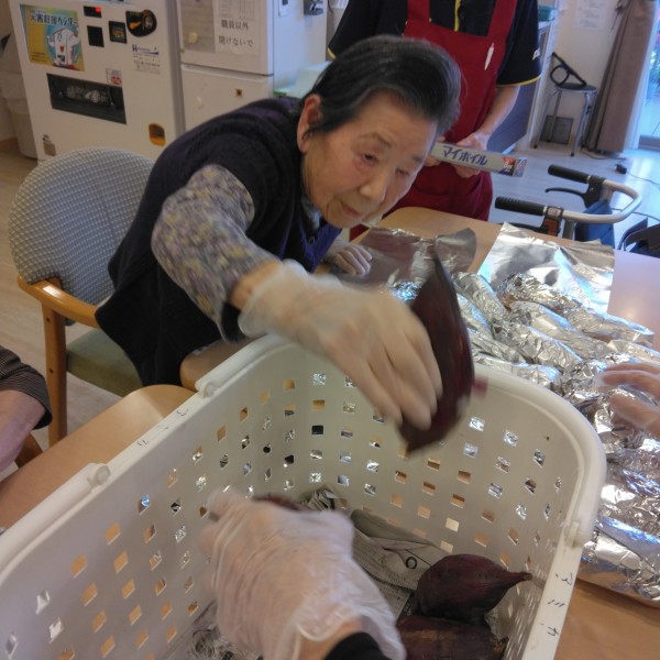 手を伸ばして芋を・・・・皆様アルミホイルをまくスピードが早いです
