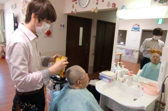 みんなの家・川崎多摩登戸の開所当初よりずっとお世話になっている訪問理美容の理容師さんは、入居者様の名前や個性などよくご存知です。