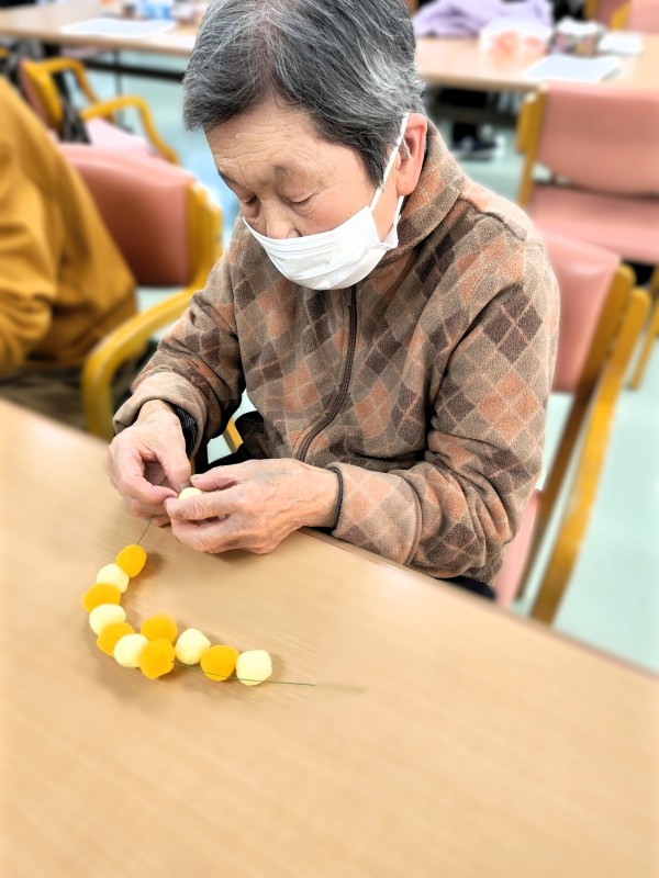 最初にお好きな色味のポンポンに針がねを通していくのですが