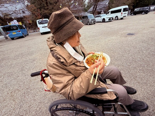 参拝の後は、境内にあるまこと屋さんでお楽しみの軽食タイム。川越名物の太麺やきそばは、モチモチの麺に香ばしいソースが絡みお味も食感も最高でした!「これは美味しいね!」「外で食べると格別だね!」と皆様大満足。