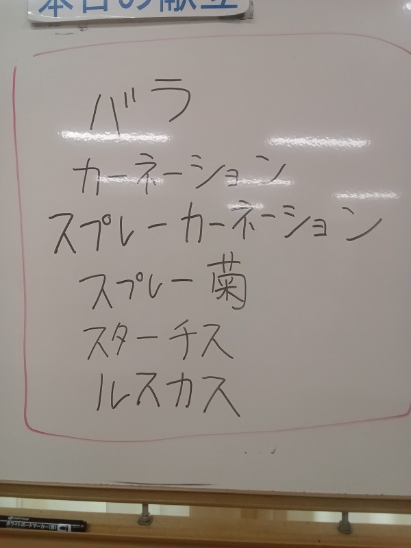 ホワイトボードに今回使用する花を書いています。