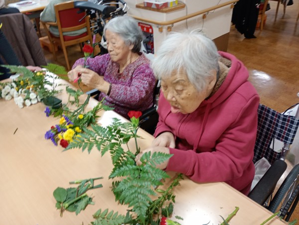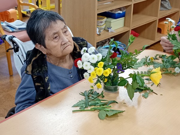 今回は、毎月恒例の1Fデイサービスと合同でフラワーアレンジメントを行ったので