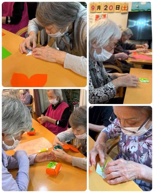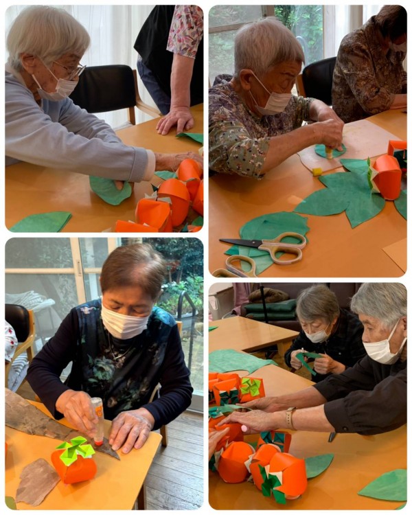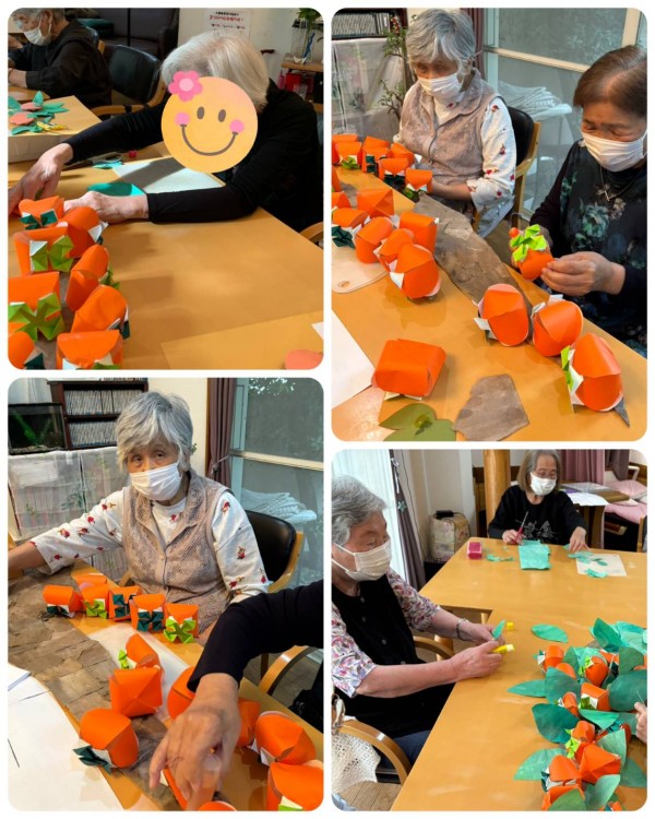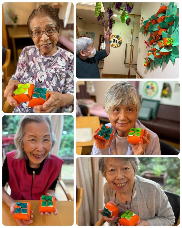 この秋は、折り紙を使い、たわわな柿の木を作りました。