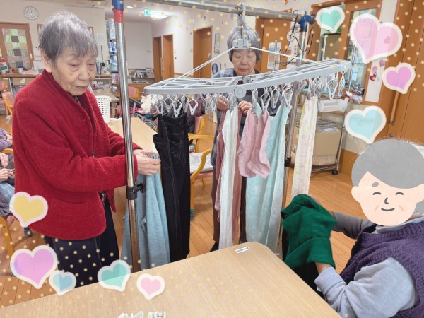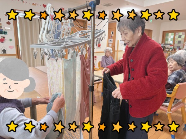W様から「座りながらで良ければ何か手伝う事ある?」と仰ってくださりお天気も良く洗濯干しを手伝って頂くことに☆