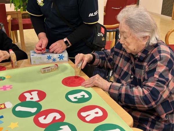 アミカの郷ちとせでも、入居者の皆さまと一緒にクリスマスの準備を始めました。今年は、手作りのサンタさんやプレゼントを飾ったもみの木の壁絵アートを、2つ作成しました。