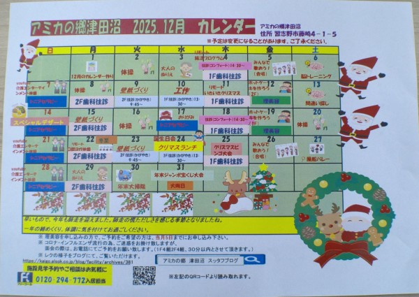 こんにちは(❁´◡`❁)。介護付き有料老人ホームアミカの郷津田沼スッタフブログです!(^^)!いつもご覧いただきありがとうございます。今年も残すところわずかとなり、慌ただしい師走を迎えました。施設では皆様が安心して笑顔ですごせるよう、変わらず温かい時間づくりに努めてまいります。恒例のクリスマス会や年末の行事と企画をご用意しております。また理美容は年内(12日.19日が最後となりますので、ご利用の際はスタッフ及び事務所までお知らせください。よろしくお願いいたします。