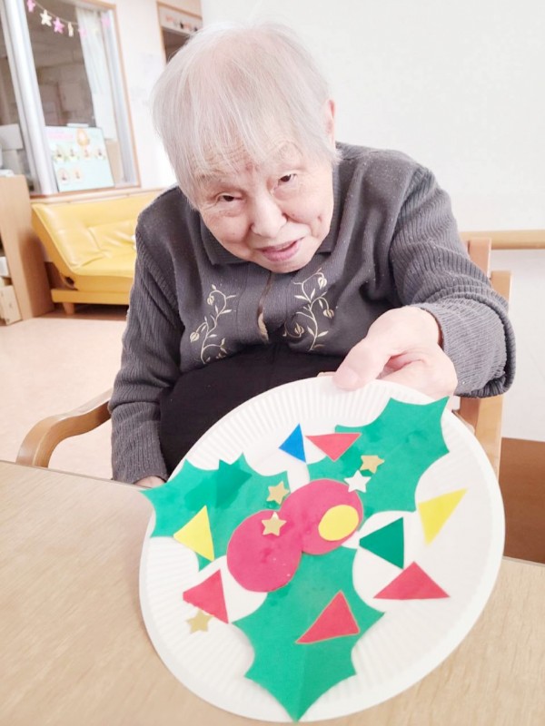 斜め向かいのY様と顔を見合わせながら、楽しそうに作業を進めておられました。職員が完成を褒めると、肩をすくめて照れ笑いされる姿がとても印象的でした。