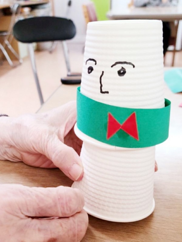 「どこに貼ればいいの?」と確認しながら、パーツにご自身で丁寧に糊を付けて真剣に貼り付けておられました。職員に「きれいにできましたね」と声をかけられると、照れたように「いやいやいや…」と微笑ましい反応をされていました。