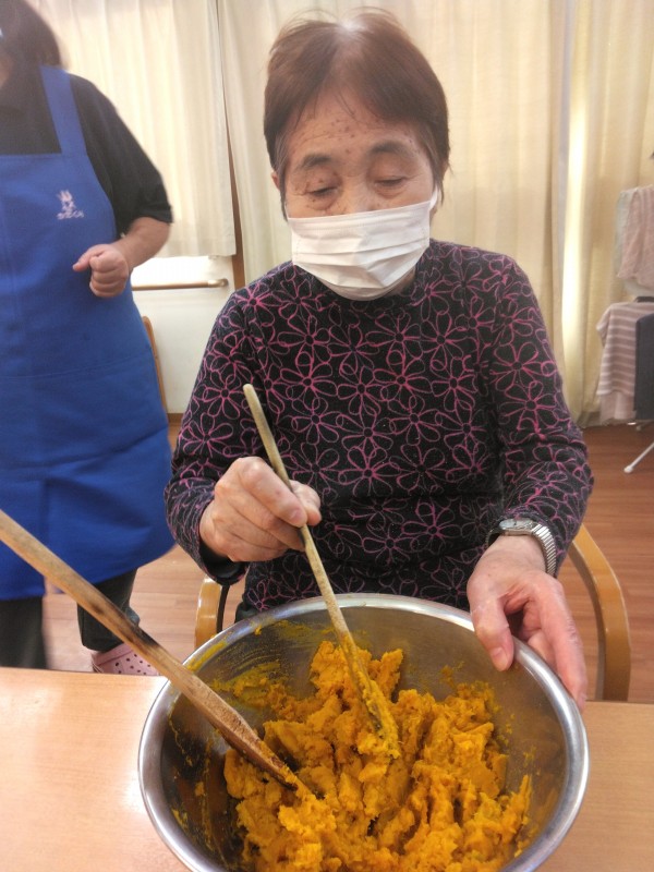今が旬のかぼちゃをみんなでつぶしてあんこを包んで茶巾絞り(^^)v
