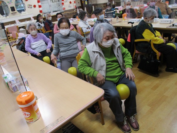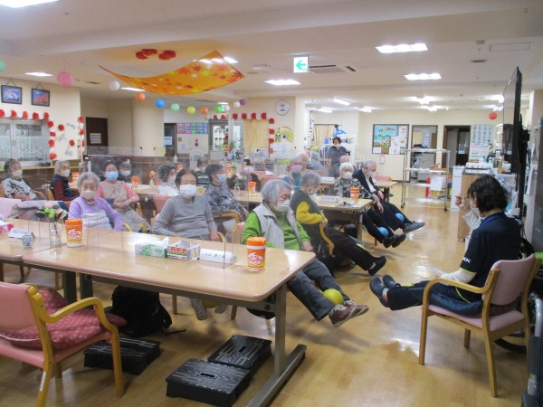 本日午後のレクリエーションは【介護予防運動】です。ボールとセラバンドを使用し、全身をしっかり動かしながら、筋力維持とバランス昨日の強化を目指します。