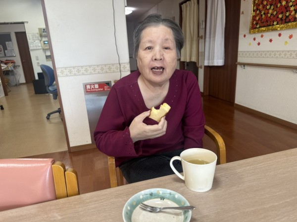 おやつにカステラを召し上がったご利用者様が素敵な笑顔を見せてくださいました(*^^*)