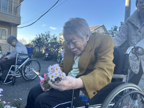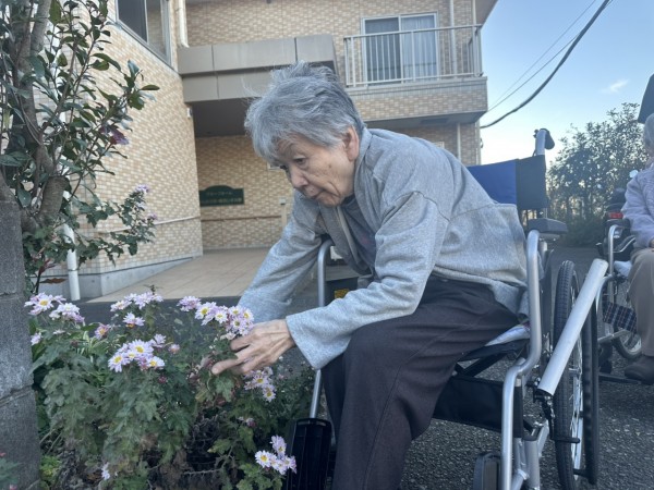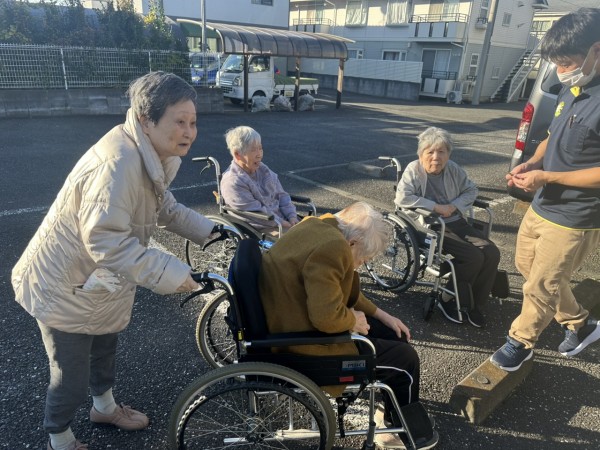 天気が良かったので、ご利用者様たちと外へ出て外気浴を行いました。