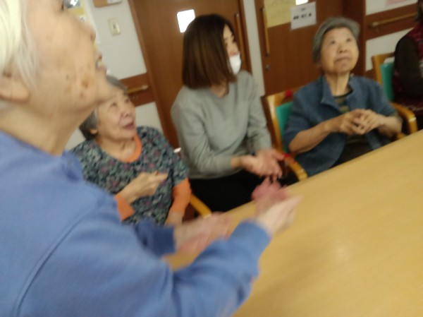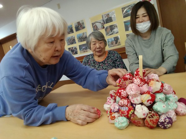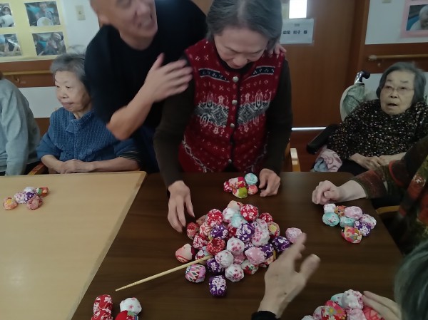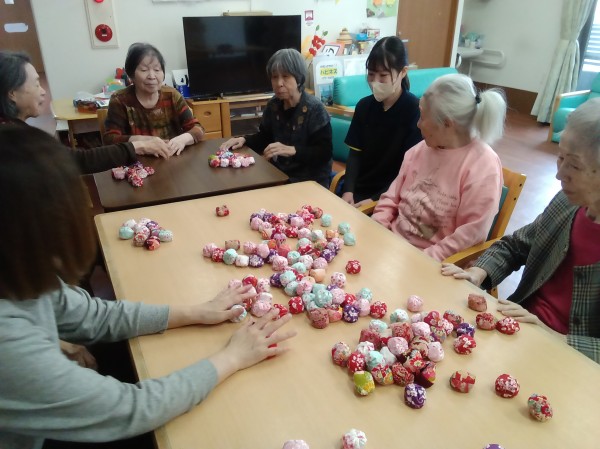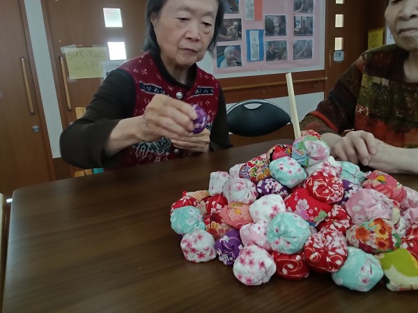 昔は五つ位は出来たのにー。や、小さいからやりにくい…などと言いながらも、皆さん上手にお手玉をされていました(*^-^*)