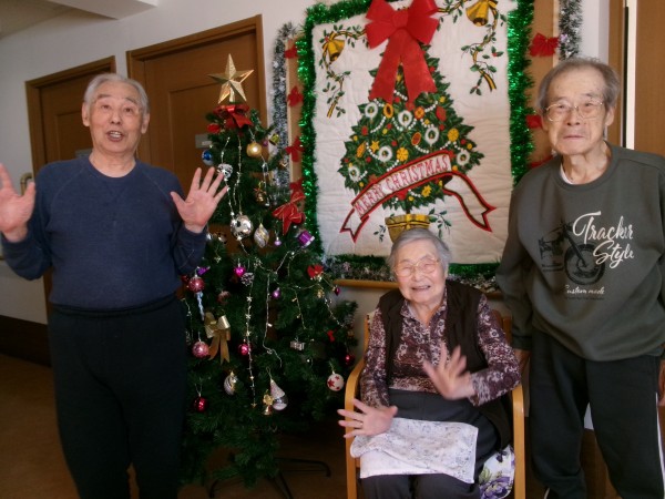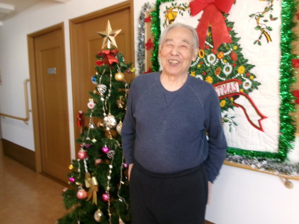 力作のクリスマスツリーのまえで、