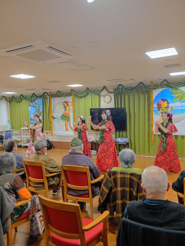 今回は、先日、1階デイサービスにて行なった「フラダンス」の様子をお伝えします。