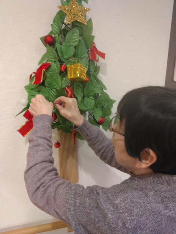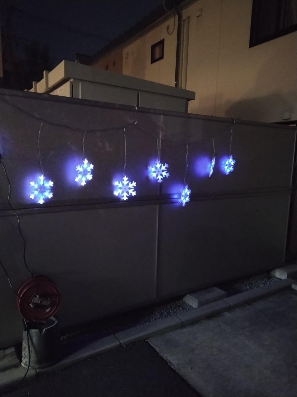 駐輪場の壁には今年も雪の結晶ライトをつけています。日が沈む時間頃から点灯しますので、よかったら見にいらしてください。