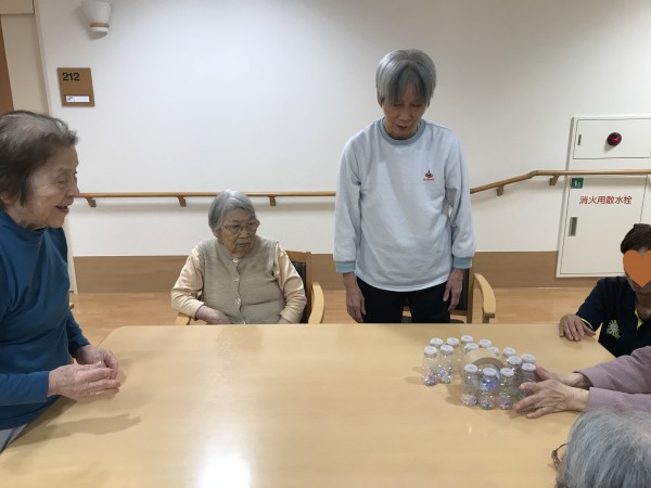 クリスマスリースと、卓上ボウリングや輪投げなどのゲームにも使えるキラキラボトルです♪