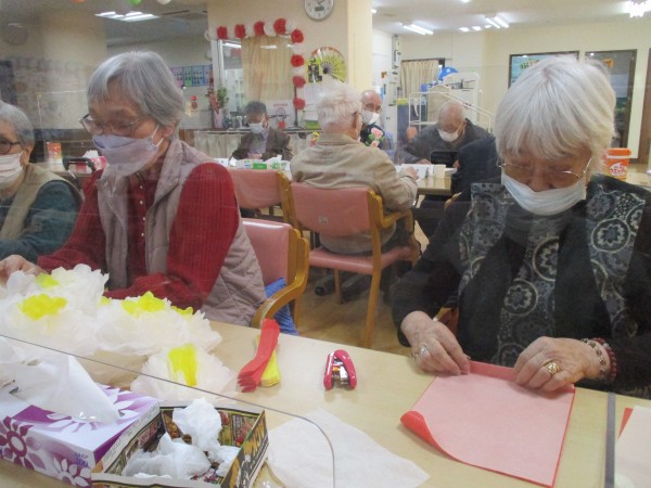 お花はお花紙を使って紅白のお花を作りました。ふんわり形を整えると、可愛らしい梅の様お花が次々と完成しました。