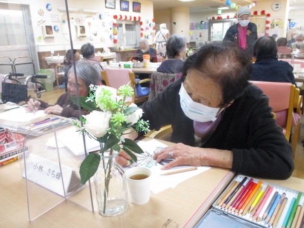 皆様じっくりと色を選び、丁寧に塗り進みながら、「ここは明るい色の方が華やかね」「ここは何色にしようかしら?」と職員や周りの方と会話をたのしみつつ集中されていらっしゃいました。