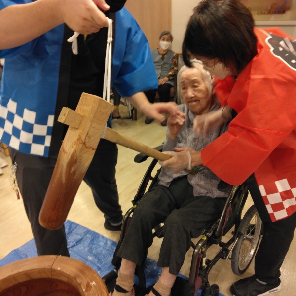 最初は少しこねる為にホーム長と男性スタッフでつき始めました 大きな音が響きます