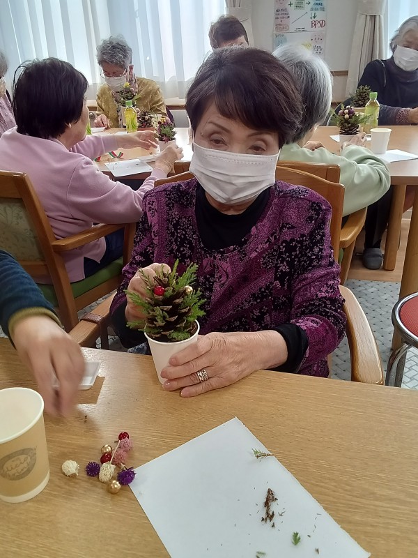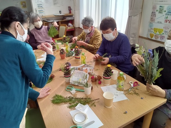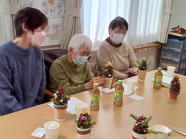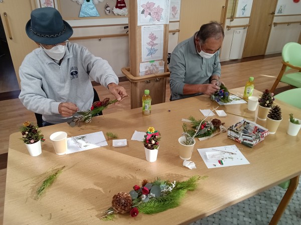 各テーブルに地域の方とホームご利用者様、職員が一緒にクリスマスの飾りを作りました♪