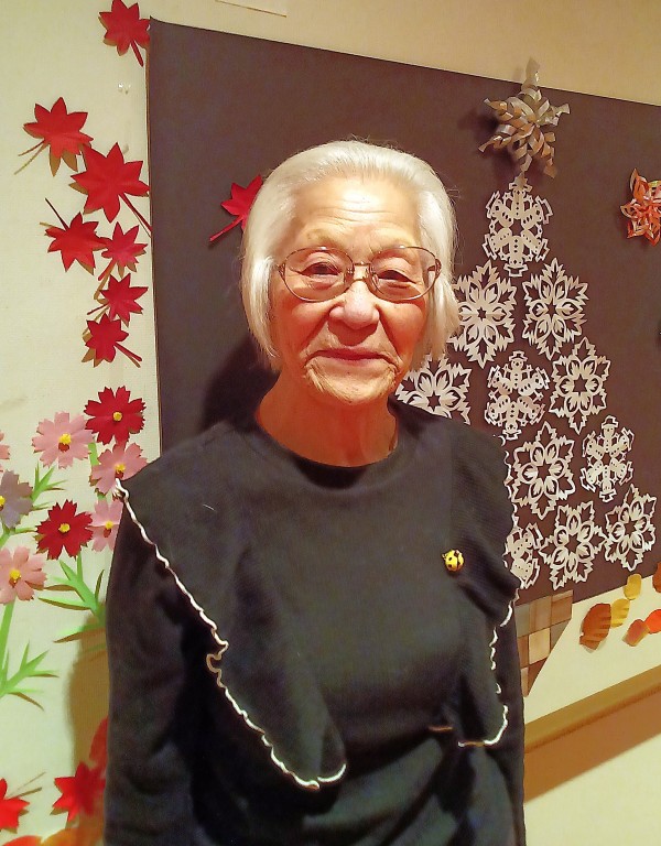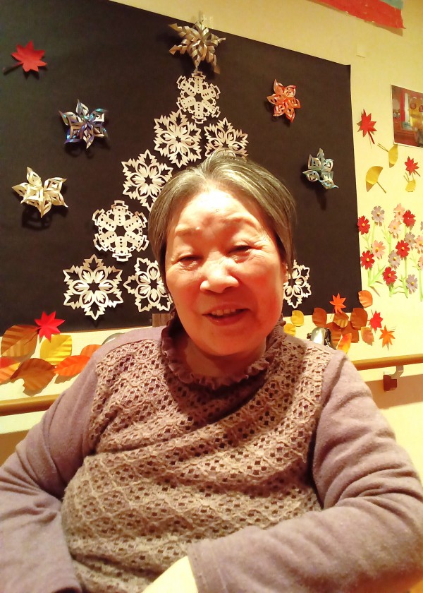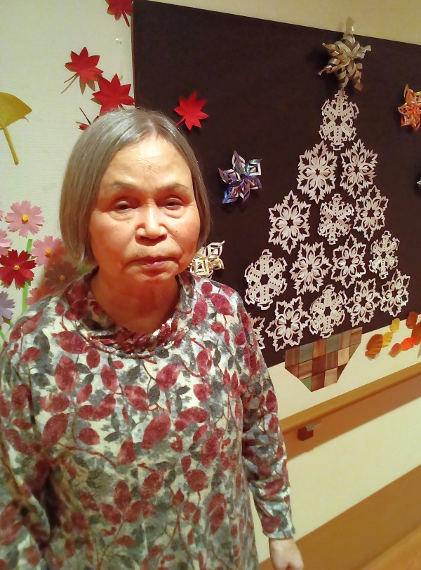 ケアスタッフお手製の折り紙で作った雪の結晶のクリスマスツリーを背景に記念撮影♪(*´∀`)