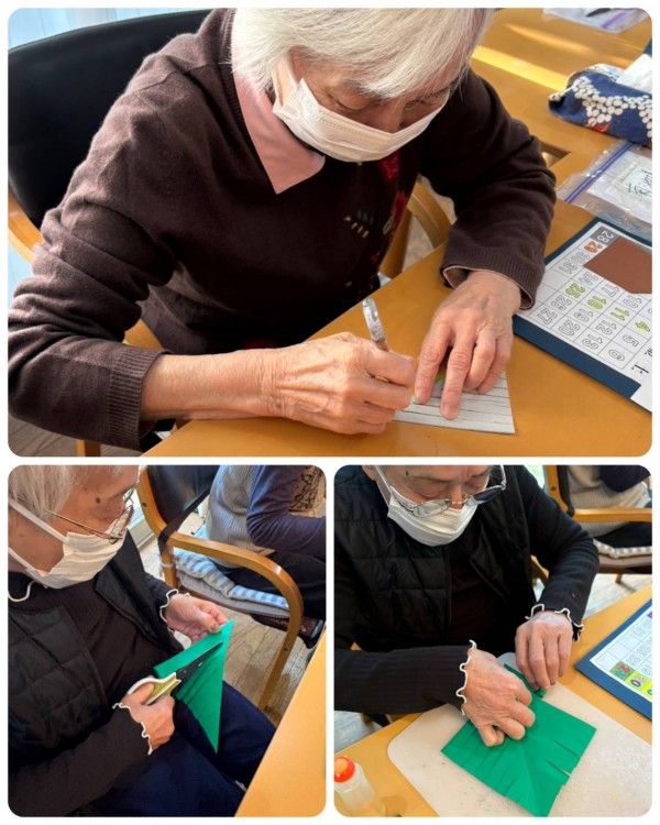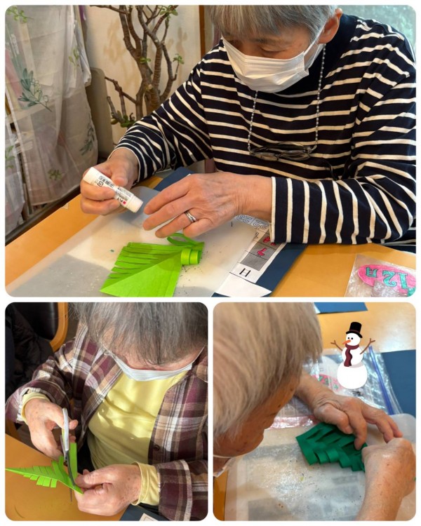 折り紙で作るもみの木は、均等に切り込みを入れ、ふわぁっと仕上がるようにのり付けです。