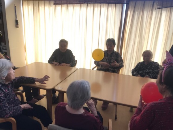 ケーキでお祝いする前に風船運びのレクリエーションを始めましょう!