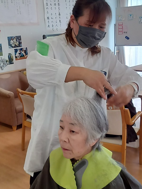 慣れ親しんだ環境の中で、職員が一人ひとりの様子を確認しながら対応し、皆さま安心した表情で散髪の時間を過ごされていました。髪を整えることで気持ちもすっきりされ、「さっぱりしたね」と笑顔が見られるひとときとなりました。