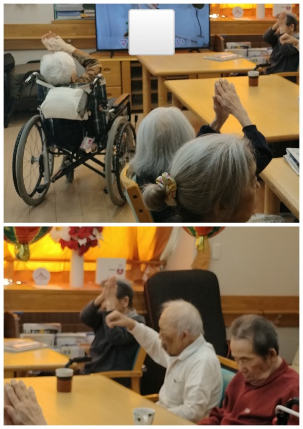 10時のお茶時間後にゆったりとできる体操を行っています!歌に合わせて体を動かせ職員も一緒に楽しんでいます\( *´ω`* )/