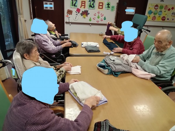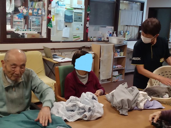 洗濯物たたみをお願いしている様子を紹介させていただきますが、入居者様とても真剣ですよね。