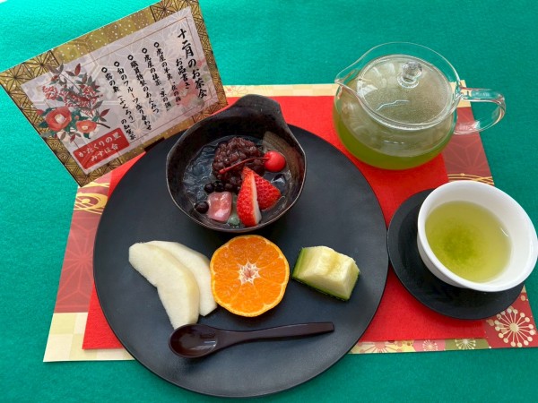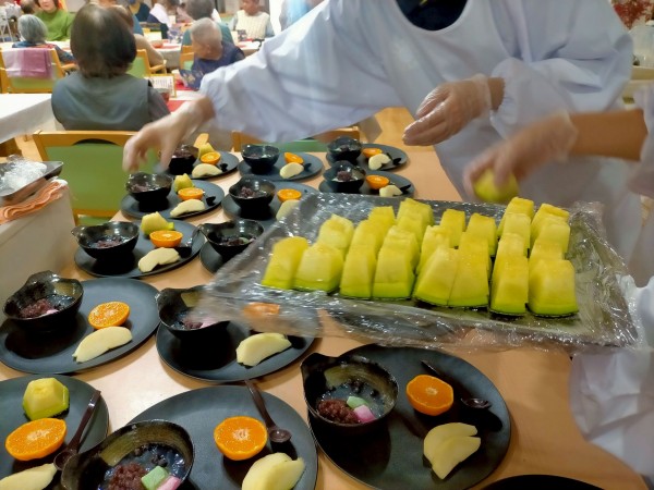 今回は手作り餡子を使って【手作りあんみつとフルーツ盛り合わせ】でした。