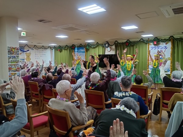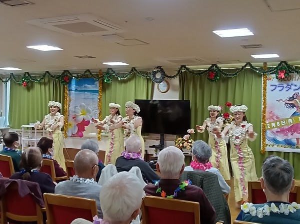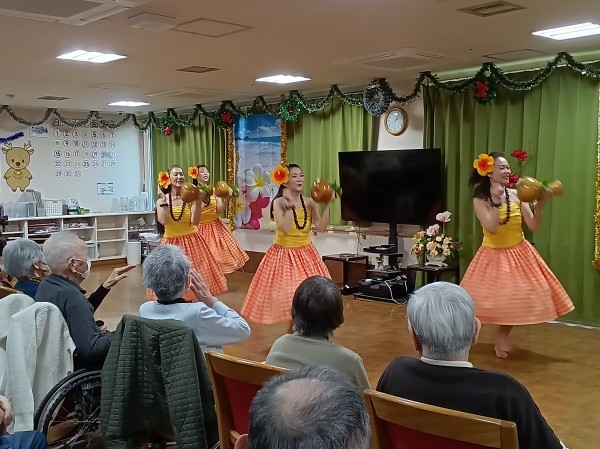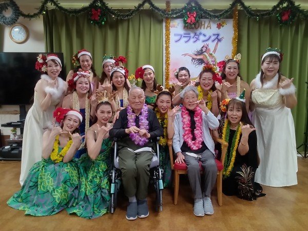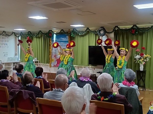 今回はなんと、ご利用者様の娘様より「両親に自分のやっているフラダンスを見せたい」とのご要望があり、是非とも!とこの企画へと繋がりました。