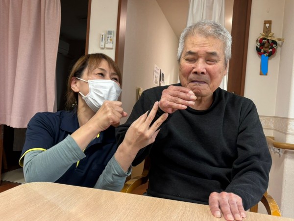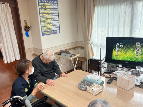 いつも静かに過ごしたい利用者様ですが、おやつ前に他の利用者様とのレクで昔懐かし曲を流すと、口ずさみ歌われていました!