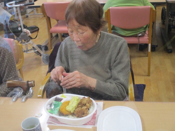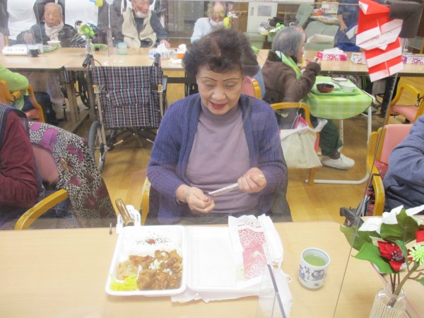 唐揚げが美味しいと評判のお店ということもあり、ふたを開けた瞬間から「わぁ!」と驚きの声が上がります。お弁当は、お手頃ながら満足感たっぷりのボリューム。特に唐揚げは一つひとつが大きく、「これは食べ応えがあるね」と皆様びっくりされていました。中には食べきれず、「職員さんもどうぞ」と分けてくださる方もいらっしゃり、職員までしっかり満腹に…ありがたいひとときでした。