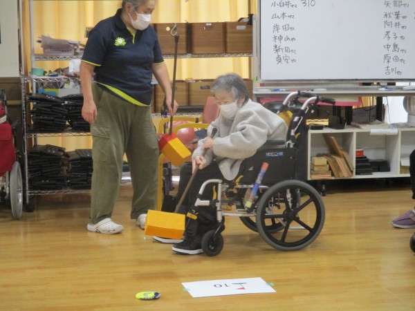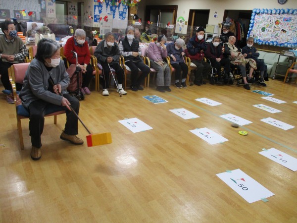 「思った方向に行かないな」「力加減が難しいね」と、皆様真剣な表情。ボールが高得点の位置に止まると、自然と拍手が起こり、ホールは大いに盛り上がりました。3回打った合計点を競うゲーム形式で、一打一打に集中しながらも、笑顔と声援があふれる時間となりました。