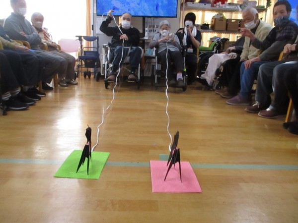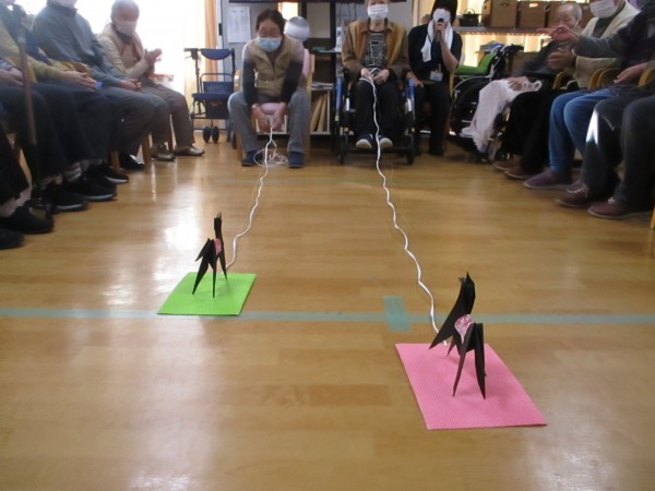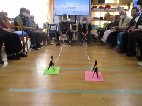 ゲームの内容は、馬に紐をつけ、2人が並び馬を引きます。どちらが早く馬を引き寄せられるかを競います。力任せに引っ張るのではなく、タイミングや力加減が必要です。軽い馬なので、勢いよく引きすぎると倒れてしまう場面もあり、「倒れちゃった!」「もっとゆっくりだね」と笑い声があふれました。倒れないように調整しながら引くことで、自然と集中力も高まります。手作りの遊馬と、皆様の工夫が合わさり、笑顔いっぱいのとても楽しいゲームとなりました。