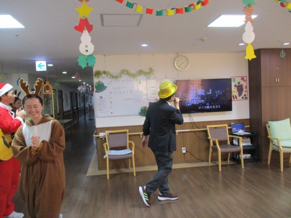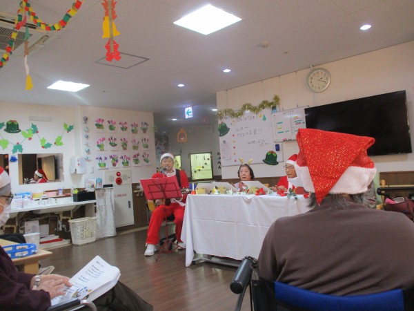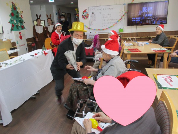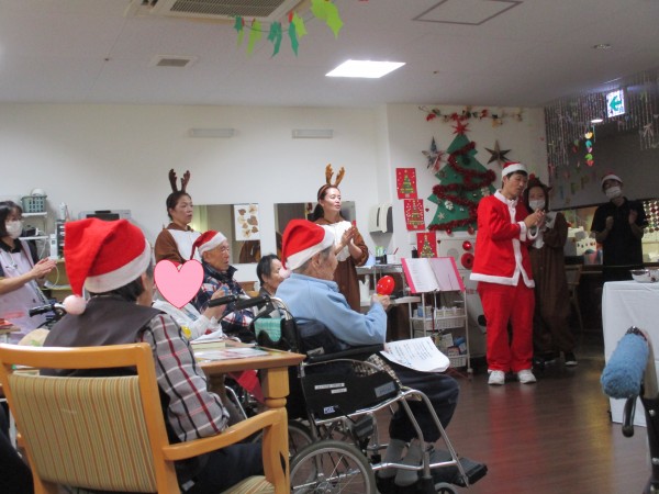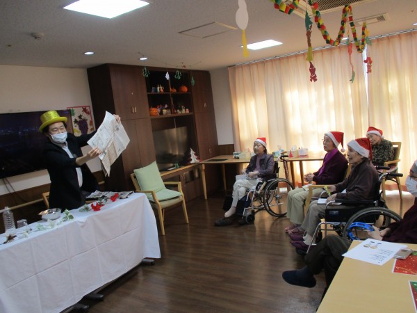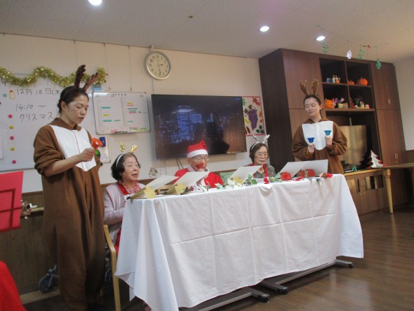 職員はサンタやトナカイ、雪だるまの服装をして、利用者様はサンタ帽をかぶって準備万端!