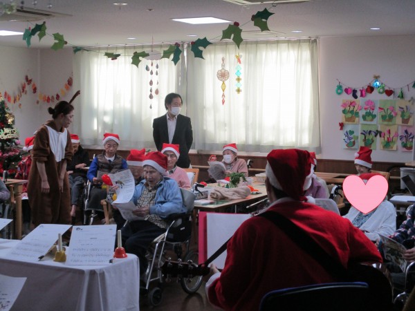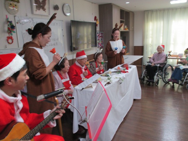 お次は、職員と利用者様によるハンドベル演奏。冬の定番ソング「雪」披露してくれました♪
