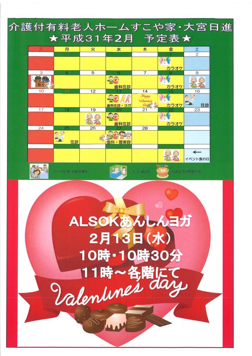 介護付有料老人ホームすこや家大宮日進の2月のカレンダー(予定表)が出来ました!