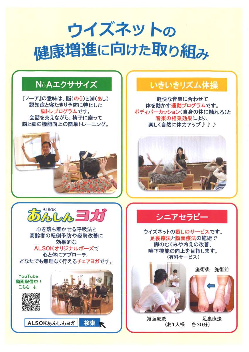 毎週恒例のカラオケをはじめ、健康増進のためのALSOKあんしんヨガ、季節行事の節分やバレンタイン。