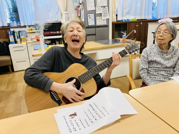 昨年の9月から来て頂いています。ギターコンサート♬ 回を重ねる度に違うギターを持ってきて下さり、皆さん興味津々!!(昨年12月のご様子です)