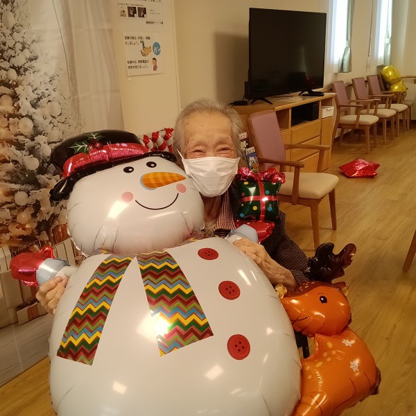 風船やサンタクロースがいて、二階は特に低い位置に風船がぶら下がっているため、食事のたびに皆さんタッチして居室へ戻られる姿がありました。