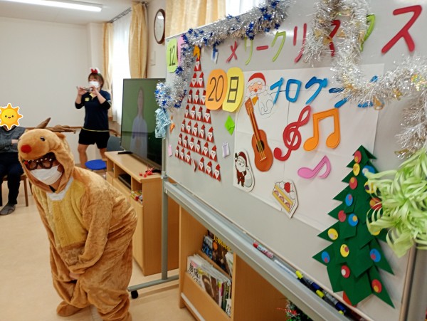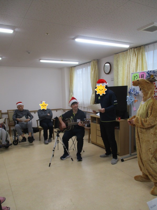 職員がサンタクロースとトナカイになり、入居者様の前で演奏を行い、みんなで合唱しました。