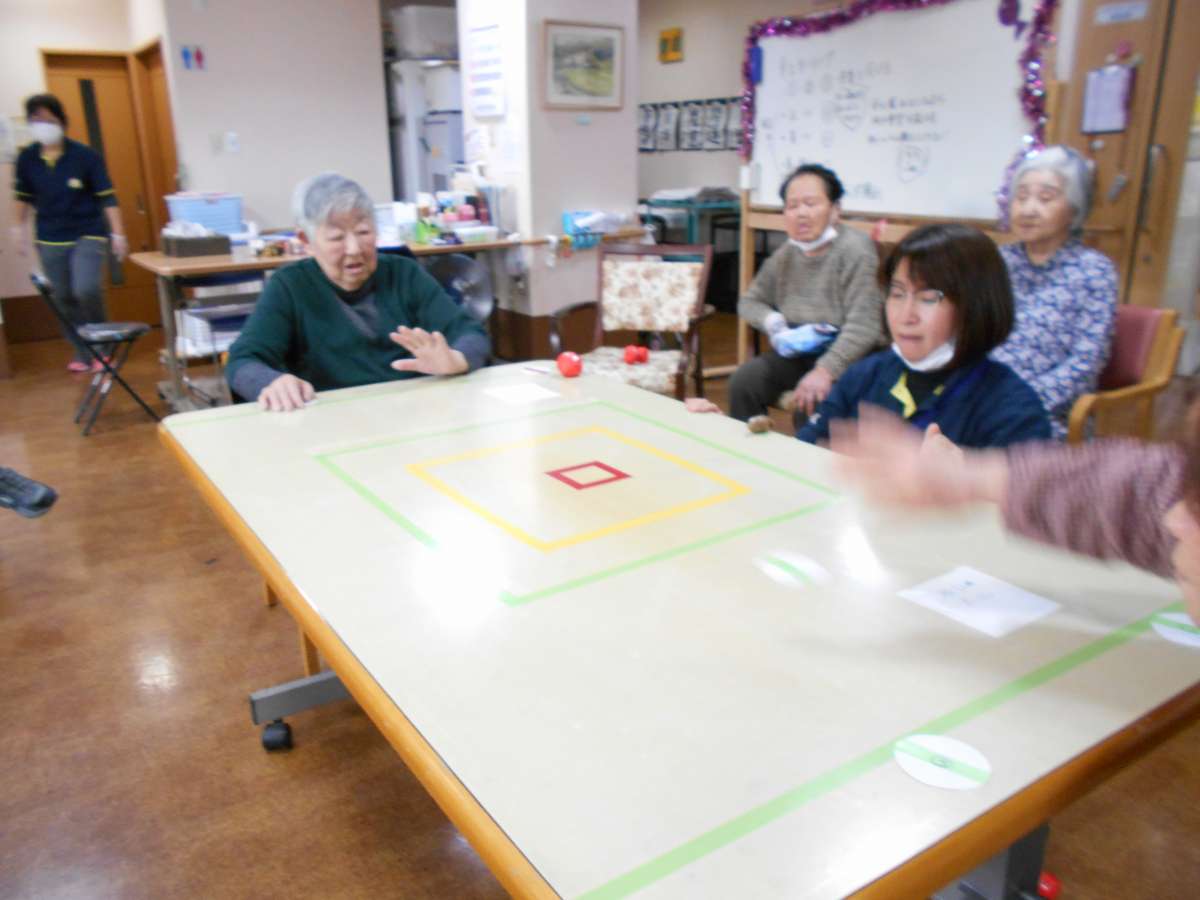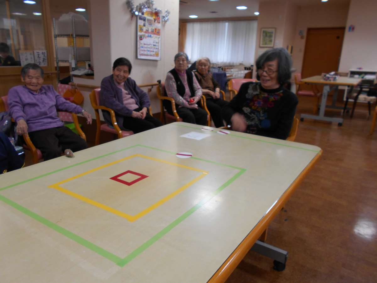 本日のレクりエーションはテーブル上でカーリング!!