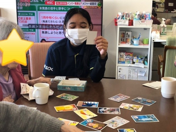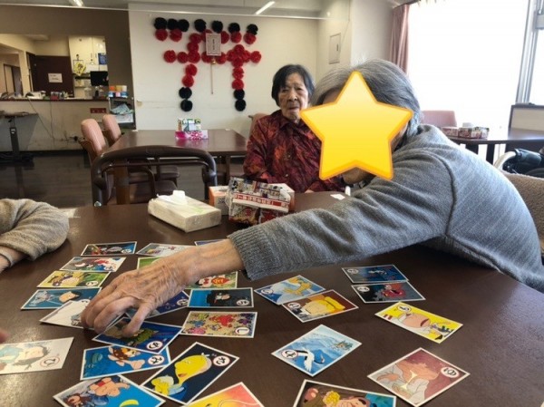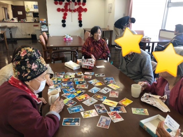 午前中のゆっくりとした時間を狙って近くにいた方を集めてカルタをした様子です♪♪