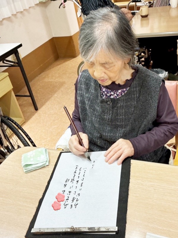 職員と一緒に一文字ずつ確認しながら書かれる方もいらっしゃいました。Y様は「そんなの出来ないよう」とおっしゃいながらも、いざ始めると「正月」のニ文字を一気に書き上げられ、力強い作品が完成しました。Ⅰ様は書道の段をお持ちで、「ここは跳ねるんだっけ?とめるんだっけ?」と少し迷われながらも、「謹賀新年」をとても達筆に書いてくださいました。