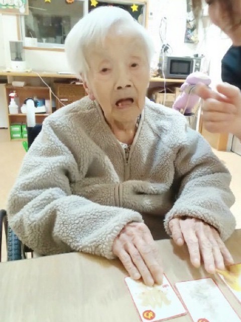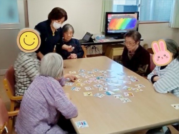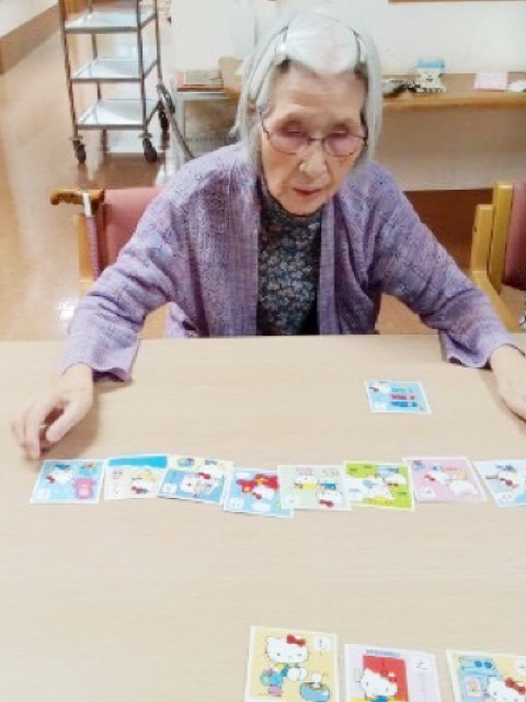 4階ではクイズ形式のカルタに挑戦しました。K様は最初、他の方に札を取られてしまい悔しそうなご様子でしたが、途中から少しずつ巻き返し、笑顔で楽しまれていました。4階は負けず嫌いな方が多く、白熱した勝負が繰り広げられていました。