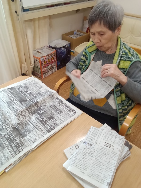 こんなにたくさん新聞折ったの!⁉ 後ろに折った新聞が紙袋とダンボールの中に山積み。「読み終わった新聞があれば、折りますよよ」と。折った新聞の利用は、捨てるものを包んで処分します。だから沢山、折った新聞があるとたすかるんです。(職員より)
