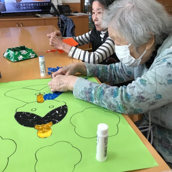 折り紙をちぎり、のり付けをして